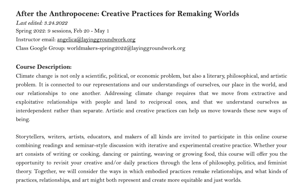 Designed syllabus and implemented online course offering the opportunity to revisit creative and/or daily practices through the lens of philosophy, politics, and feminist theory. The course asked: how can embodied practices remake relationships, and what kinds of practices, relationships, and art might both represent and create more equitable and just worlds?